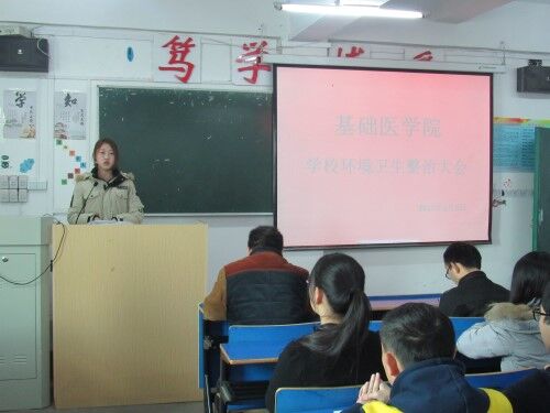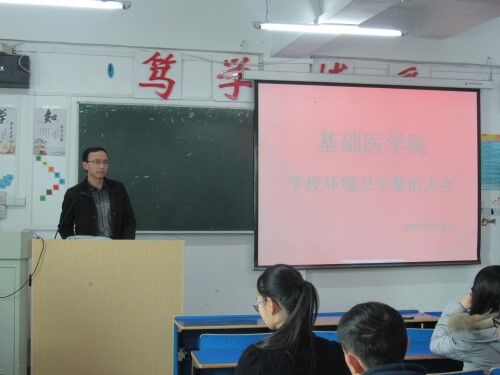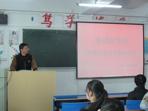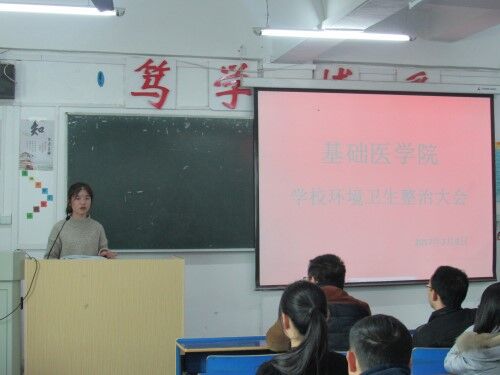 为了全面改造学校环境卫生,营造良好的生活学习环境,3月8日中午,基础医学院在思贤楼阶四召开了学校环境卫生整治大会。参会人员有班主任、各班班长、团支书、劳动委员、生活委员、劳动部和生活部成员、学生会主席、学生团总支书记和各班入党积分子,会议由学生科郑锋老师主持。