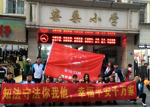 12月12日,基础医学院B1613班部分同学前往柴桑小学与大中路步行街,开展“知法守法你我他,幸福平安千万家”主题团日活动。柴桑小学于惠敏老师热情接待了同学们。