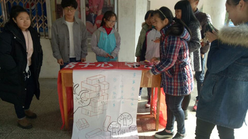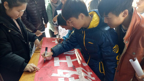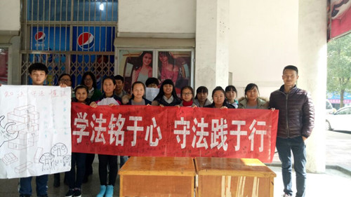 活动一开始,同学们摆好桌子拿出印有“学法铭于心,守法践于行”的横幅,而后,班上同学们围绕法律这一主题为同学们讲了法律知识,并积极呼吁同学们加入我们“法律与我同行”活动,邀请他们在横幅上签上自己的姓名,以表支持。