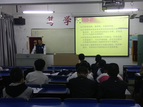 在同学们的热烈鼓掌下,郭友走上了讲台。他首先讲解了共产党员的义务以及所享有的权利,并且着重强调了义务与权力之间是相互依存,相辅相成的关系。接下来他又详细地为同学们说明了申请入党的条件及要求,随后详细向同学们介绍了发展党员的各个程序,最后他希望全体同学端正入党的动机,以实际行动争取早日入党。
