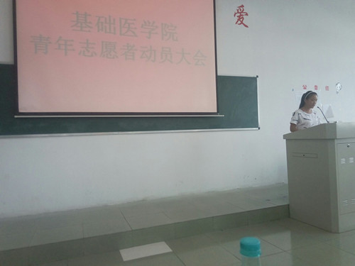 | 9月28日中午,基础医学院青年志愿者队于华文楼阶二召开青年志愿者动员大会,全体青年志愿队新成员参加此次会议。  会上,基础医学院青年志愿者队队长陈云婷对志愿者队进行介绍,她从青年志愿队的发展历史讲到目前青年志愿者队的分工合作。介绍了青年志愿者队主要活动形式及活动内容;志愿者队社会实践部部长胡俊对新进志愿者进行培训,他说,青年志愿者队是一支奉献的队伍,我们应该怀着崇尚的敬意投身于社会实践活动之中,在奉献中收获,于锻炼中成长。  会上,全体人员集体奏唱《青年志愿者之歌》。最后,志愿者队队长陈云婷带领新进志愿者进行庄严宣誓。  本次活动为今后青年志愿者的工作打下坚实的基础,同时也让新进的志愿者们明白了最为一名青年志愿者的社会责任感与使命感。 |