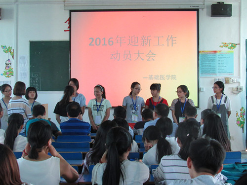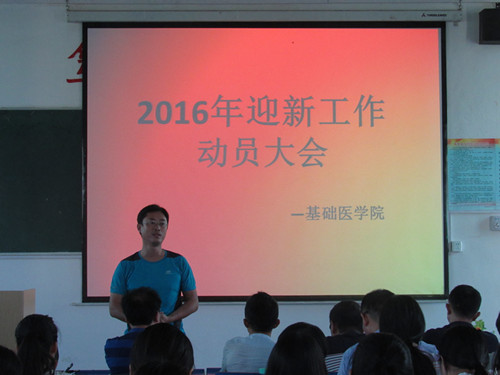 |   9月2日下午,基础医学院在浔东校区思贤楼文阶五教室召开2016年迎新工作动员大会,基础医学院党委书记余朝阳到会讲话,学院学生科、团委负责人,辅导员,新生班班主任以及全院全体迎新工作人员参加此次大会。此次会议由姚中平老师主持。  会议首先由部分迎新工作者就新生报到流程进行预演。随后老师对同学们的预演情况进行点评和指导。余朝阳书记首先对同学们的报到预演给予肯定,也指出其中的不足,并提出了一些建设性建议。   会议最后,团委淦明南书记作迎新工作动员讲话,他提出迎新工作的相关要求和注意事项,并强调每位迎新人员一定要坚守自己的岗位,不能擅离职守,并且在迎新工作中拿出最好的精神状态,以展现基础医学院大学生的应有风采。最后,他对同学们前期所做的努力表示感谢,并预祝此次的迎新工作获得圆满成功。 |