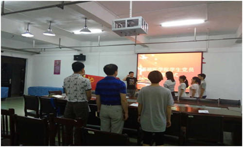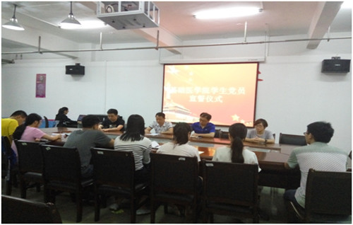 | 6月28日下午,基础医学院学生党支部新党员宣誓仪式在华文楼105圆满举行。基础医学院党委书记余朝阳出席宣誓仪式,学生科副科长张波,辅导员徐霖、邓琴老师以及学生预备党员邓奕婷,徐奖,吴子霞,余茜同学参加宣誓仪式。党支部书记张波老师主持仪式。   仪式在神圣庄严的《国际歌》乐曲中拉开了序幕,同志们在歌声中怀念先辈,勉励自己。歌曲演唱完毕后,由徐霖老师带领全体新党员面对党旗,举右拳,进行庄重而严肃的宣誓仪式。接下来便进入到预备党员的发言环节,邓奕婷同学代表新党员表达了入党的激动心情,重新陈述了入党动机,并保证会遵守自己的誓言,努力学习,用自己所学的知识为人民服务。   余朝阳书记代表学院党委对四位新党员表示欢迎,并强调党的纪律性和组织性,强调党员的责任义务,表达了对新党员的殷切希望和充分的信任。  此次仪式不仅仅标志着党员队伍新鲜血液的注入,更激励各位新党员们以饱满的热情和伟大的责任意识投入到党的建设中去,为党的事业尽自己的一份绵薄之力。 |