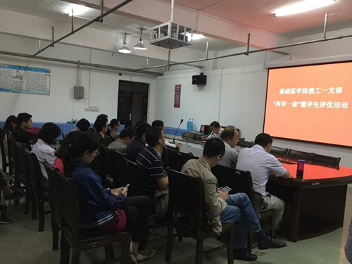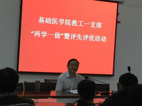 | 按照九江学院《关于在全校党员中开展“两学一做”学习教育实施方案》要求和基础医学院“两学一做”学习教育工作部署, 2016年6月2日下午4点,基础医学院教工一支部在华文楼105室召开了支部大会,开展“两学一做”专题学习会。  会议首先传达学习了江西省委第八巡视组巡视九江学院党委情况反馈会的会议精神;并开展了优秀党员的评选工作。  傅文学书记组织大家学习了《中国共产党党章》总纲部分,要求大家就党章开展深入细致的学习。希望各位党员立足自己的工作岗位,做表率,树标杆,真正发挥党员的先锋模范作用,强化党员意识,加强党性修养,坚定理想信念,践行根本宗旨,秉持严实作风,争做合格共产党员。  会议还进行了集体讨论活动。大家一致认为,作为一名高校教师,一定要刻苦钻研,不断学习,长期积累。只有这样,才能跟得上时代和社会的发展,才能在课堂上游刃有余,达到良好的教学效果。 |