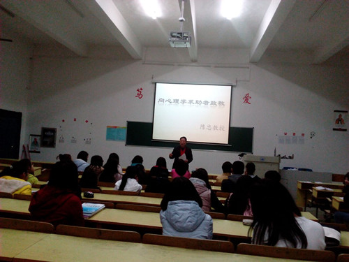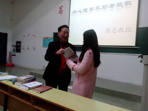 | 3月18日晚,陈忠教授应邀在华文楼阶梯教室二为基础医学院学子作“向心理求助者致敬”专题讲座,本次讲座吸引了众多学子前来聆听,讲座由浪井文学社社长邓婷主持。   讲座中,陈忠教授通过自身接触过的案例,向广大学子说明了心理健康的重要性,并倡导广大学子敢于向心理老师求助,排除自身的心理障碍,恢复身心健康。陈忠教授通过当前大学生学习,生活,情感方面遇到的各种问题结合实际,告诫学子们应正确对待这些心理问题,学会向他人倾述,为心减压。为了增强大学生心理健康的意识,陈忠教授指出“六祸”(谊之祸、钱之祸、情之祸、性之祸等)的危害,旨在告诉大学生心理健康的重要性。最后,陈忠教授希望广大青年能够放下手机,多读书多写字,做到“抓住今天,做好做完自己乐做的事”。  讲座最后,陈忠教授还耐心地解答了同学们提出的问题,并将书籍赠予同学,希望同学们能够健康快乐的成长。  整场讲座,75岁的陈忠教授慷慨激昂,以生动又深沉的语言,开启同学们的心扉,增强了大学生心理健康意识,报告厅内时有掌声雷动。 |