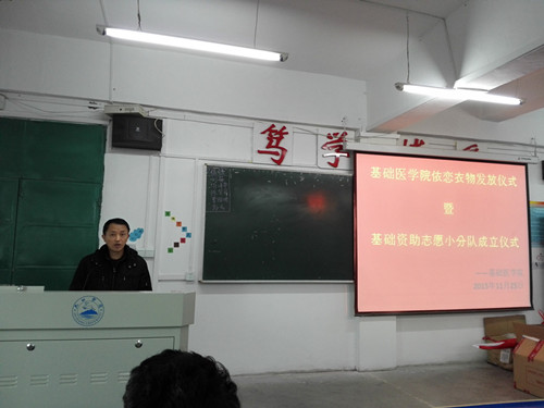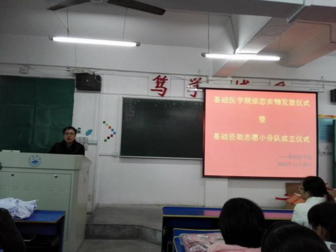 为体现学校对大学贫困生的关心和照顾,11月25日下午,基础医学院于思贤楼文阶四教室举行依恋衣物发放暨资助志愿小分队成立仪式,基础医学院党委书记余朝阳、学生科副科长张波、辅导员邓琴以及大一、大二贫困生参加此次活动。