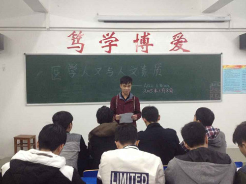 | 11月8日晚,基础医学院A1421定向班于华文楼301召开了“医学的人文精神与人文素质”主题班会。  在班长曹锐同学进行了简短的开场白后,同学们进行了深刻的思考,纷纷对“医学的人文精神与人文素质”进行发言,看法理解各有不同,有的说人文精神是医学的核心,医学的使命就是对人从生到死的全过程的关爱和尊重,人文素质则包括人文知识和人文精神,是一个人综合素质的重要体现;有的说人文精神指的是医者的品质和社会责任,无论置身怎样的环境都不能放弃爱心、责任心和进取心,坚持以人为本,以人为中心的精神;最后在大家的积极讨论后,主题班会圆满结束。  此次主题班会,旨在让同学们加强医学生人文素养的提高,达到了预期目的。 |