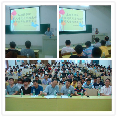 6月18日晚,基础医学院在浔东校区华阶二教室举行“学风建设月总结表彰大会暨考风考纪教育大会”,基础医学院院长车向新、党委书记余朝阳、副院长郑美蓉、副院长汪鑫出席会议,相关部门负责人、全体班主任辅导员、各班班长、团支书及学生代表300多人参加了大会。大会由学生科副科长张波主持。