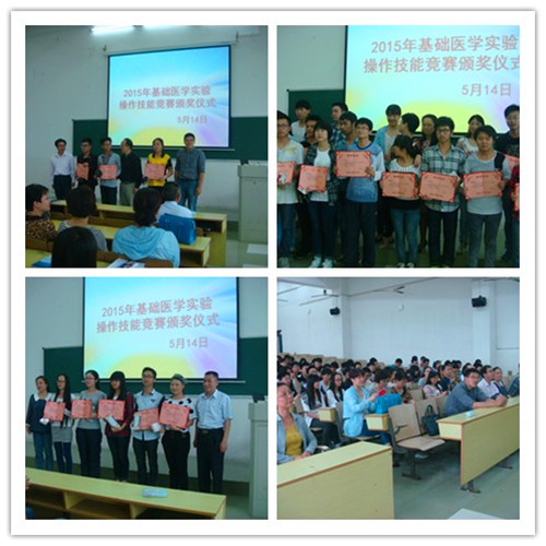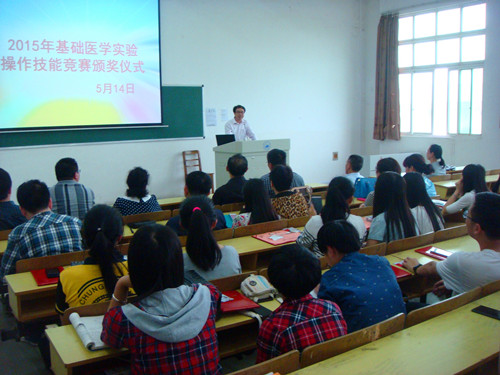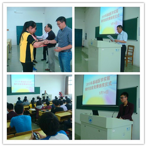 5月14日下午,基础医学院于华阶二举行首届医学实验操作技能竞赛颁奖仪式,出基础医学院院长车向新、党委书记余朝阳、副院长郑美蓉、副院长汪鑫,校实验中心实践教学管理科科长郭松,学生科、基础实验中心的老师席仪式。2014届临床本科的同学们参加了此次颁奖仪式。