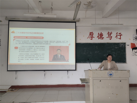 会上,樊云燕首先带领大家学习了党的二十大报告中习近平总书记对教育的论述。樊云燕强调,同学们要深入学习论述中的思想内涵,坚定不移听党话、跟党走,怀抱梦想、脚踏实地,立志做有理想、敢担当、能吃苦、肯奋斗的新时代好青年,让青春在全面建设社会主义现代化国家的火热实践中绽放绚丽之花。