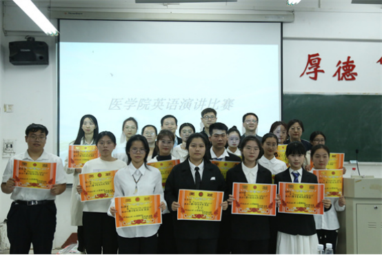 选手们的表现得到了评委们的高度评价。评委们一致认为,参赛选手们不仅在语言表达上表现出色,而且在演讲技巧和演讲内容上也有着不俗的表现,充分展示了同学们的英语水平和医学专业综合素质,也突显了我院在专业英语教学方面的成果。其中,朱冰妍同学和谢丽馨同学荣获一等奖;肖静仪、杜一杰、戴聚海、郭昕彤、肖奕如和罗欢同学荣获二等奖;罗欣、周洋、肖梦萍、徐红霞、喻静雯、陈术、彭瑾昱、寇心悦同学荣获三等奖。