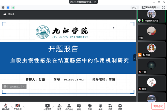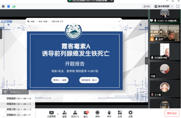 11月23日,医学院组织召开2018级预防医学专业本科毕业论文(设计)开题答辩会,受疫情影响,本次开题答辩会在线上举行。全体论文指导教师和2018级预防医学专业36名学生分4组展开论文开题答辩,医学院院长车向新、党委书记许晓源、副院长向维聂、熊建军等院领导分别参与并指导各小组开题答辩。