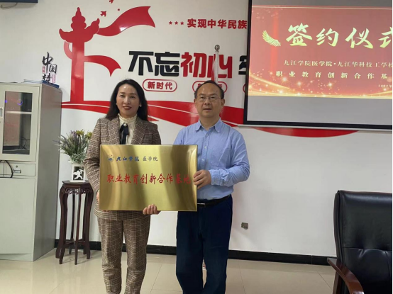 签约仪式上,车向新院长代表三亿平台授牌,向维聂副院长和陈碧霞校长代表双方院校签订了“职业教育创新合作基地”协议书。双方表示愿意发挥各自优势,助力九江市华科技工学校“康复护理、口腔义齿”等相关专业的建设和发展。形成互利双赢的发展局面。为国家职业教育又好又快发展尽职担当。
