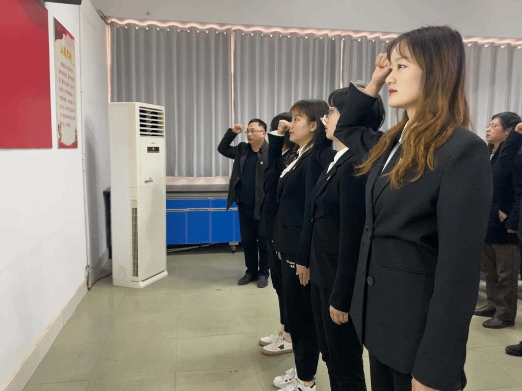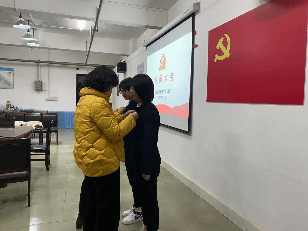 接着进行了新党员入党宣誓、老党员重温入党誓词活动。由老党员代表为两名学生预备党员佩戴党徽并表示祝贺,黄涛带领大家宣誓。随后黄涛同志为本期入党积极分子培训班“优秀学员”颁发证书。