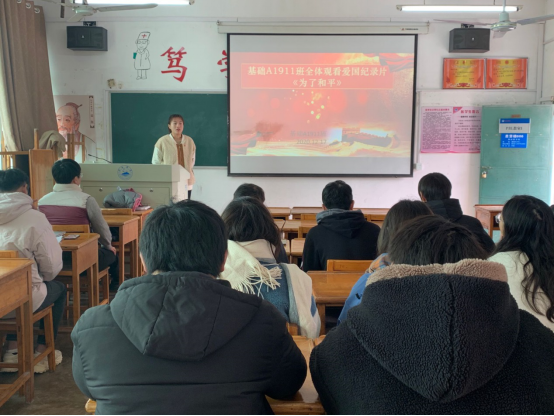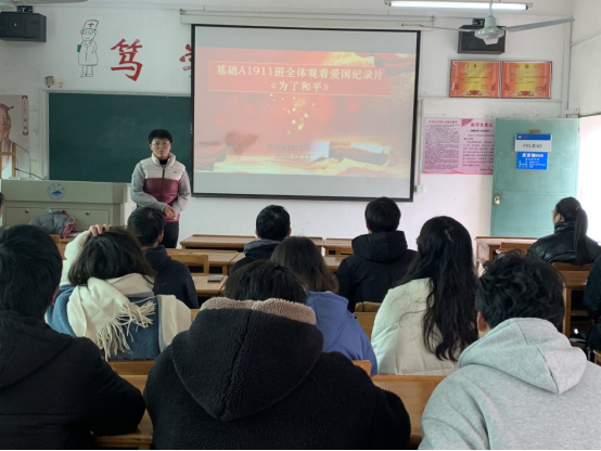 为深入贯彻落实习近平总书记在纪念中国人民志愿军抗美援朝出国作战70周年大会上的重要讲话精神,深入开展“四史”学习教育,大力弘扬伟大的抗美援朝精神,加强新时代爱国主义教育,教育引导广大师生厚植爱国主义情怀,按照《教育部办公厅关于组织全体教师观看大型电视纪录片<为了和平>的通知》(教师厅〔2020〕15号)要求,2020年12月17日中午12时,基础医学院基础A911班全体师生,基础A1801班预备党员刘璐璐同学在思贤楼606教室召开以“为了和平”为主题的班会。