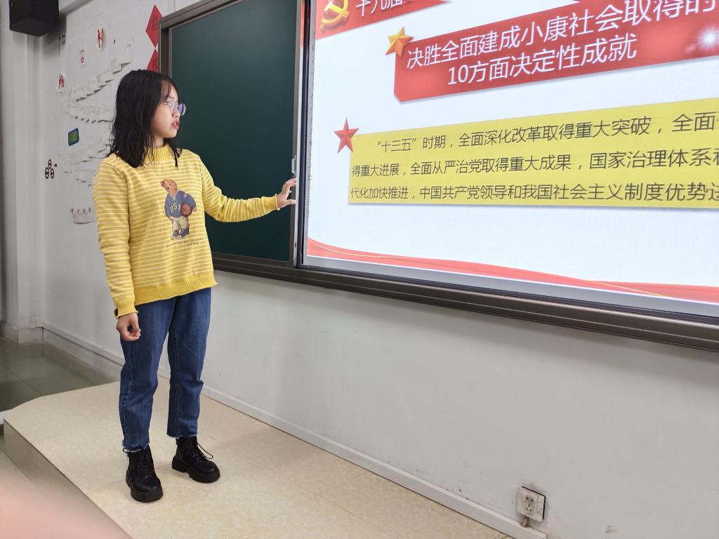 我国发展环境面临的深刻复杂变化,面临着机遇与挑战,及到二0三五年要实现的9方面远景目标让同学们更加坚定了未来的发的目标。实现奋斗目标的12方面具体举措明确了如何去实现规划。最后,吴菁同学讲到了十九届五中全会十四个关键词,加深了同学们对十九大五中全会的深刻认识。