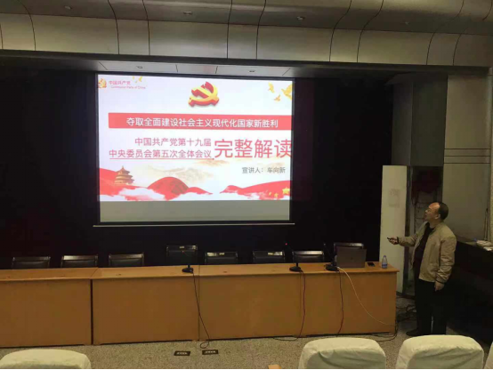 车向新同志首先分析了党的十九届五中全会召开的背景。并给全体党员介绍了全会召开时间、地点和参会人员等基本情况,以及全会的主要议程。从“1个重要判断”、决胜全面建成小康社会取得的10方面决定性成就、我国发展环境面临的深刻复杂变化、到二0三五年要实现的9方面远景目标、“十四五”时期经济社会发展的6个方面主要目标、实现奋斗目标的12方面具体举措等方面解读了十九届五中全会公报。