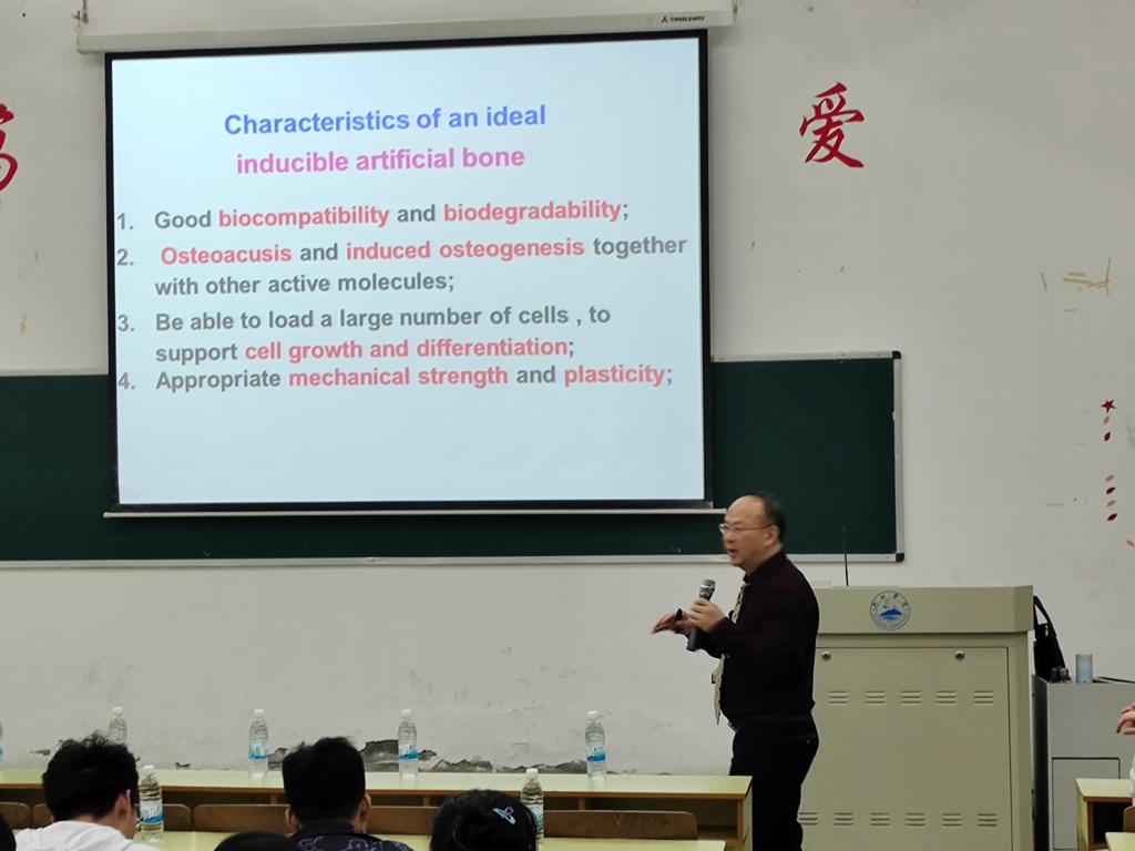 11月5日,基础医学院在华阶二教室举行了学术讲座,邀请了车向新院长担任主讲人。车院长的讲座题目是:“诱导型人工骨材料修复免颅骨缺损的实验研究”。200多名学生聆听了讲座。