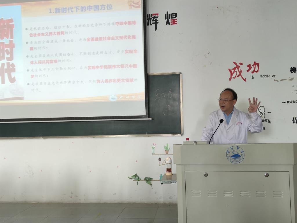 讲课伊始,老师们便说到了本次课堂的主要内容就是要为同学们有更好的获得感打下基础。四位老师分别就九江学院的校史、校风、校训、校歌为大家进行了详细的介绍,说到作为一名九医学子首先要知道我们学校的校训是“竟知向学,厚德笃行”;校徽上面是一只白鹿,1901是九江学院历史的起点,只有了解了校史,大家才能有真正的归属感,才能真正做到先立德后学习。