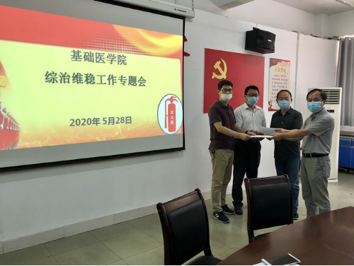 5月28日上午,基础医学院在华文楼105 会议室召开了学院综治维稳暨消防安全专题会议。学院党政领导班子成员及各部门、教研室负责人、支部书记参加了会议,会议由学院院长车向新主持。