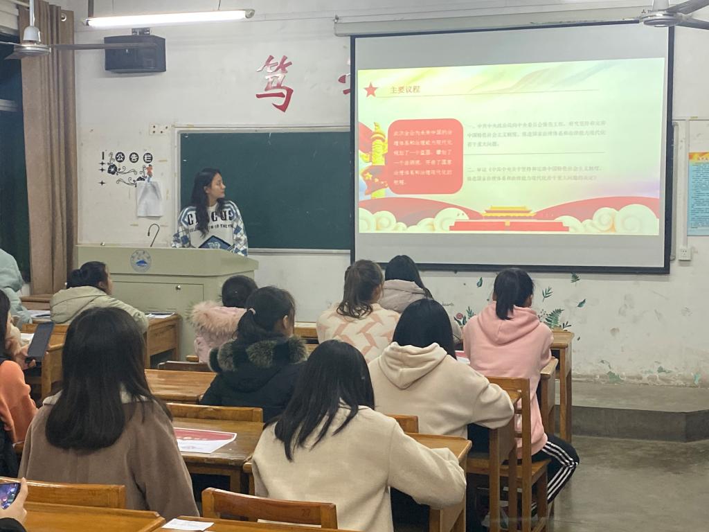 主题班会上,入党积极分子们向同学们介绍十九届四中全会“六个亮点”,一是准确把握国内国际两个大局,着力抓好“发展和安全”两件大事,将“安全”与“发展”并列;二是首次系统提出了中国特色社会主义制度和国家治理体系的“十三大显著优势”;三是提出了国家治理体系和治理能力现代化分“三步走”的总目标;四是提出了“十三个坚持和完善”;五是制度兴,国家兴,“制度”的重要性和作用被提升到新的高度;六是提出了“必须严格依照宪法和基本法对香港特别行政区、澳门特别行政区实行管治”,要坚定推进祖国和平统一进程。这其中,宣讲人员着重讲解了“十三大显著优势”,详细阐述了党和人民在长期实践探索中形成的优势体系。