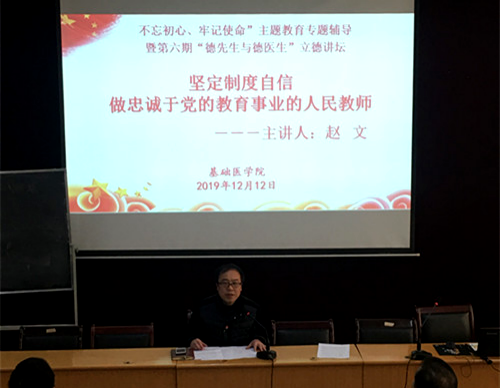 12月12日,基础医学院在浔东校区立本楼三楼报告厅召开党的十九届四中全会精神学习会暨第六期“德先生与德医生”立德讲坛,邀请学校宣讲团成员、马克思主义学院赵文博士进行宣讲,基础医学院党委班子和全体教师参加学习。学习会由党委书记余朝阳主持。