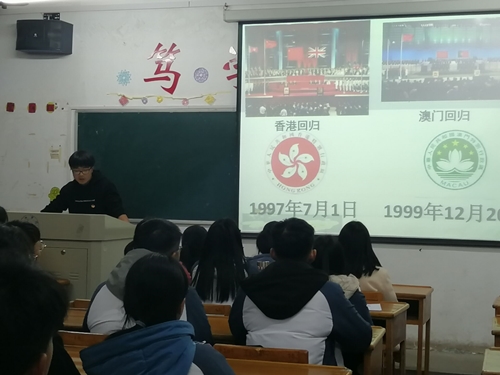 12月4日晚7点15分,A1921、B1921班于思贤楼608开展了此次活动。活动伊始,B1921班团支书带来了精彩的开场白,并且给同学们播放了澳门回归的视频。紧接着在同学们饱含深情地歌唱了《七子之歌》后,B1921班团支书从反对分裂、一国两制、解决台湾问题的有利因素、国家政府的对台政策这四个方面进行了详细讲解,让同学们有了一个更加深刻的认识。最后,两班的团支书带领大家宣誓,传达着对祖国的热爱,此次活动也在掌声中圆满结束。