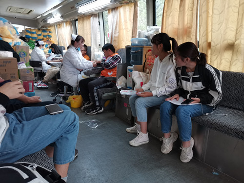 在中心血站工作人员的指导下,志愿者们为同学们解答有关“献血前健康征询”一栏的疑惑,并帮助同学们正确填写献血登记表及基本信息。填完表后,同学们还要经过测血压、验血型等一系列必需流程,最后由志愿者带领来到血车上进行抽血,整个献血区在志愿者的帮助下变得井然有序。