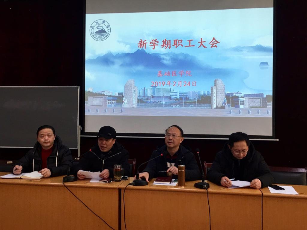 2月24日下午,基础医学院在浔东校区立本楼三楼学术报告厅召开新学期职工大会,学院领导班子以及全院教职工参加会议。会议由院党委委员傅文学同志主持。