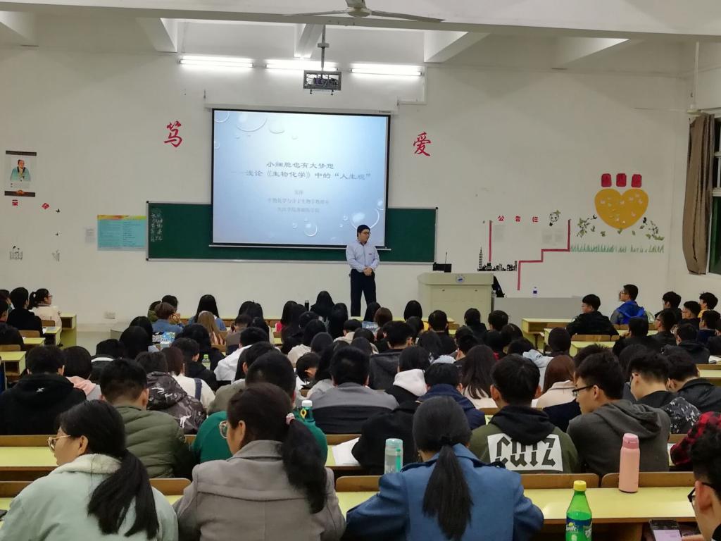 作为基础医学院“学术活动月”的重要内容之一,11月7日晚,基础医学院吴伟博士在浔东校区华阶二教室作了主题为《小细胞也有大梦想——浅论<生物化学>中的“人生观”》的学术讲座,参加讲座的学生包括2018级预防医学和2017级口腔医学专业本科学生。