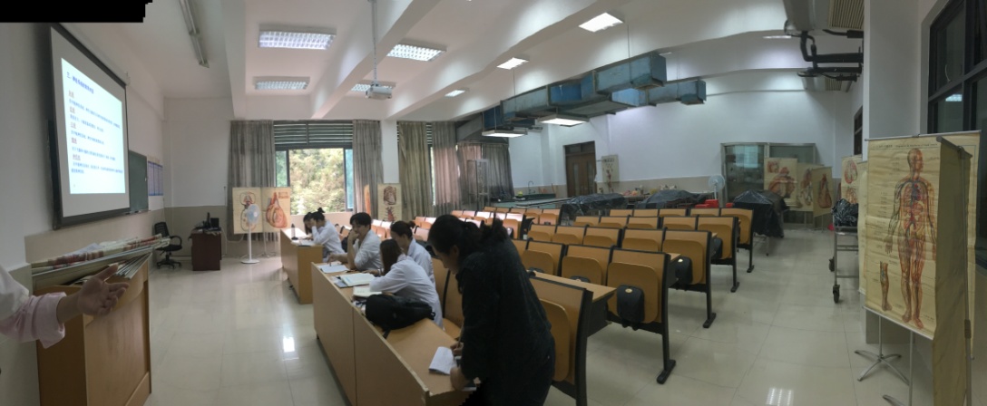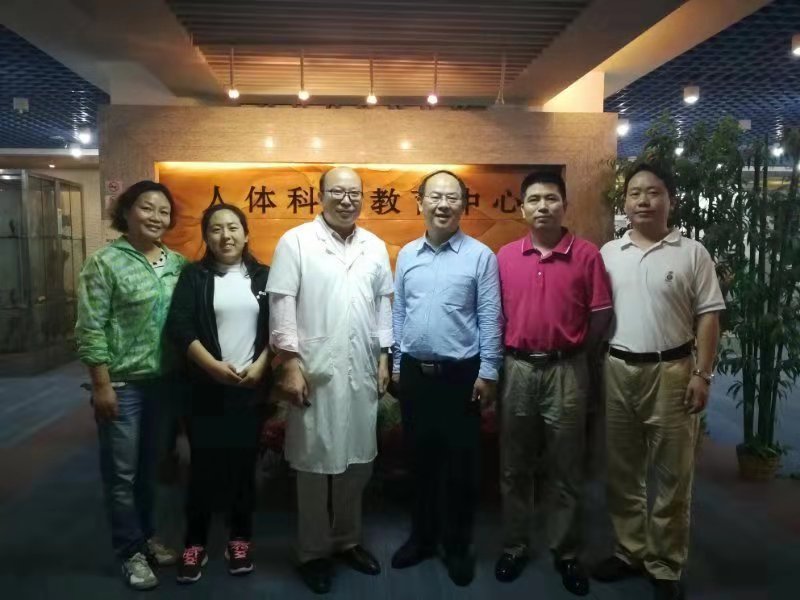 实验楼由七层主楼和一座三层耳楼组成,每个实验室为120 m2,每两个实验室之间有一个60 m2的准备室。每层设置公共实验室。实验室显微镜统一管理,专人维护。病原生物学实验室的准备间的生物安全等级为P3实验室,并设有洗刷室。将解剖楼单独设在耳楼,一楼建有可存放五十具尸体的冰冻尸库、升降式解剖台和局解室;二楼为系统解剖实验室,实验室前排设有排凳,可供30-40学生听课,后排为移动操作台,墙边有移动解剖挂图,三楼为人体科学教育中心,免费对外开放,承担着科普一日游的公益活动。中心研究的塑化保存生物类文物对古尸保存和岭南文化传承具有助益。车院长了解了其主要功能及维护经费来源。