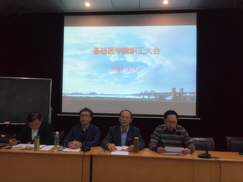 11月1日下午,基础医学院在浔东校区立本楼三楼报告厅召开了职工大会。基础医学院院长车向新、党委书记余朝阳、副院长许晓源、党委委员傅文学以及全体教职工参加会议。会议由余朝阳书记主持。