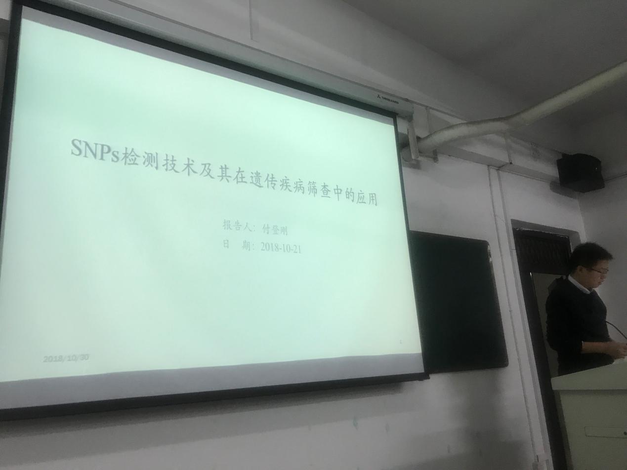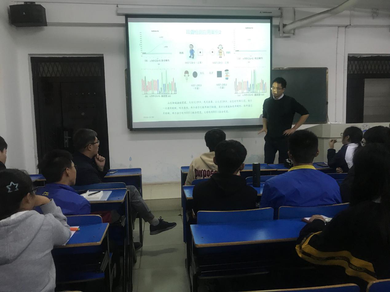 10月21日晚上,基础医学院付登刚博士在浔东校区华文楼102教室作了题为《SNPs检测技术及其在遗传疾病筛查中的应用》的学术讲座,药理学教研室主任熊建军博士、社会医学与公共卫生学教研室副主任黄邵鑫博士及 2018级预防医学本科专业全体学生参加了本次讲座。