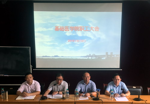 9月2日下午,基础医学院在浔东立本楼三楼报告厅召开了新学期第一次职工大会,传达部署新学期工作。基础医学院院长车向新、党委书记余朝阳、副院长许晓源、党委委员傅文学及全体教职工参加会议。会议由傅文学委员主持。