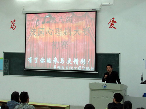 | 近日,基础医学院于浔东校区思贤楼阶四、华阶二分别进行了心理剧初赛的选拔,此次心理剧以“关爱生命,阳光你我”为主题,大一共有15个班级参赛。国家二级心理咨询师姚中平老师到场指导。      每个节目都有着不一样的精彩,各具特色,而且每个表演的同学表演得都很到位,很认真:其中一个节目就是以医学为主题,讲述一个医生刚开始对在医院中的各种不满,之后又因为自己的失误而导致一个老爷爷受伤,因这件事而认识到了自己的错误,心理不断转变,最后成为一名好医生的故事。还有的班级以懒惰为题材,演绎一个如何从一个小胖子成为女神的故事,故事情节真实,内容激励人心。每个班级的题材都很好,而且完美的突出了主题,经过激烈地角逐,最终有八个节目晋级决赛。     此次心心理剧初赛的举办,让每个参演人员都认真地去探究了“关爱生命,阳光你我”的真正含义,“关爱生命,阳光你我”就是让我们每个人都要珍惜自己的生命,做一个积极向上,充满阳光活力的人。相信每一个节目都会渲染到其他人,给别人带来正能量! |