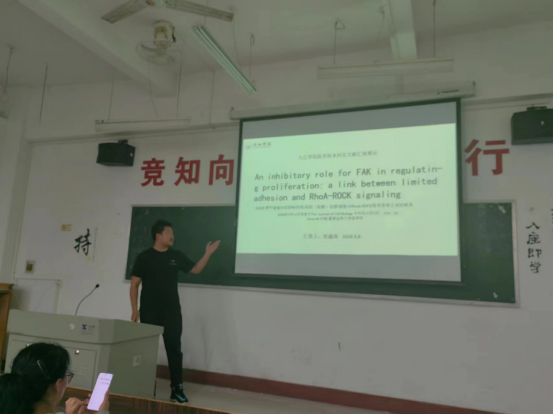 李兴暖博士指导的黄龙圣和桂鑫海两位优秀学生精心准备,深入研究各自文献课题,选出高质量文献进行阅读汇报,展现出扎实的专业知识和出色的表达能力。已经考上南京医科大学研究生的黄龙圣同学首先进行了“OTUB1通过稳定FGFR2促进成骨细胞骨形成”的文献汇报。他以清晰的逻辑和深入浅出的讲解,将文献中的核心内容和研究成果一一呈现,不仅阐述了该领域的研究现状和热点问题,还提出了自己的见解和思考,引发了在场师生的热烈讨论和深入思考。随后,桂鑫海同学分享了“FAK通过RhoA-ROCK通路调节细胞粘附性增殖”的文献研究成果,以独到的视角和详细的分析,吸引了大家的注意力,通过对相关文献的梳理和总结,展现了该领域的发展趋势和潜在的研究方向,为在场的师生提供了新的启发和灵感。