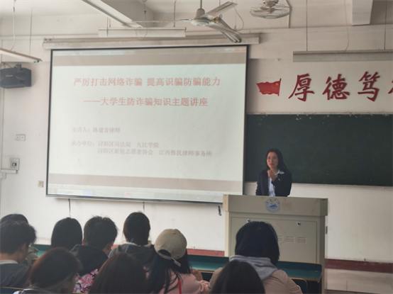 为了提高同学们的网络安全意识,有效预防和减少网络犯罪的发生,基础医学院特邀浔阳区司法局以及江西惟民律师事务所的专业人员陈建青担任主讲人,于2024年3月22日下午在义丰楼207教室,共同组织了一场“严厉打击网络诈骗,提高识骗防骗能力”为主题的大学生防诈骗知识主题宣讲。