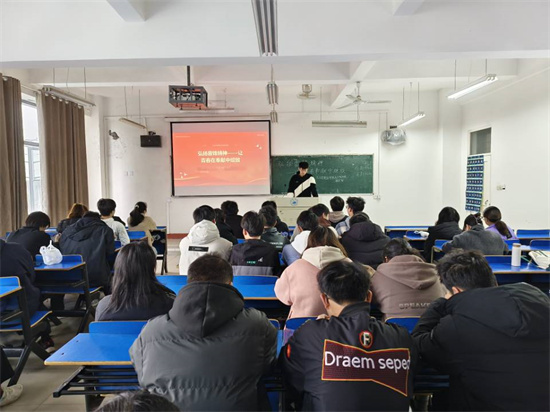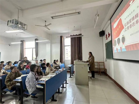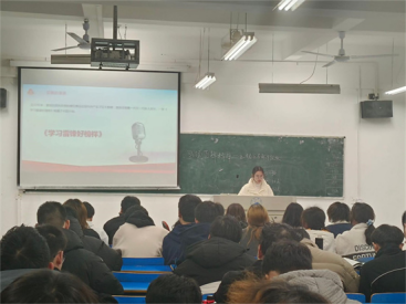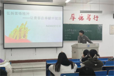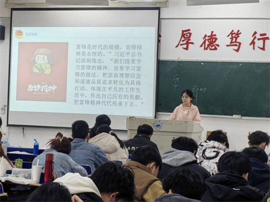 在义丰楼308,A2151班的团支书以“领悟雷锋精神,传承青春使命”为主题,阐明“作为青年的我们更应该深刻领悟雷锋精神,传承时代使命,在平凡岗位上造就不平凡的价值,让雷锋精神代代相传”的道理。