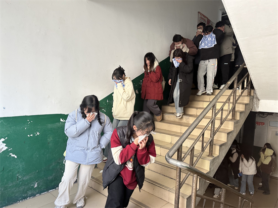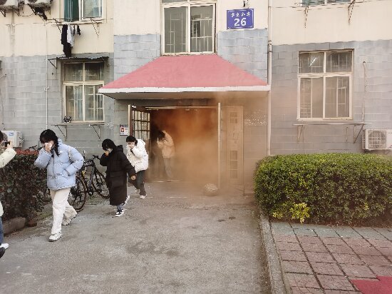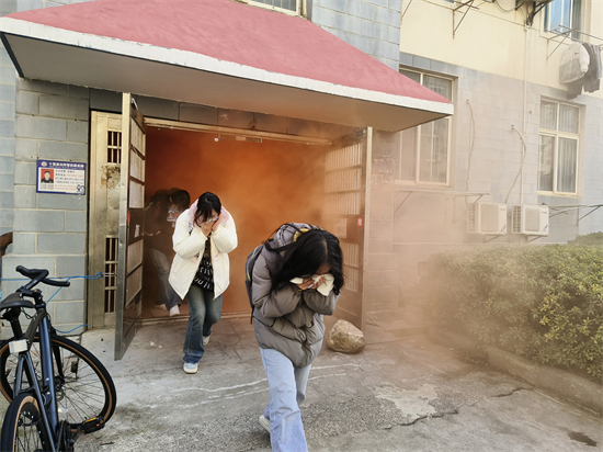 演习过程中学生科辅导员迅速组织学生撤离,同学们两人一排,利用逃生通道及时逃离火灾现场,逃生疏散时捂住口鼻,弯腰快跑,并跑至上风口集合,整个过程有条不紊地进行。