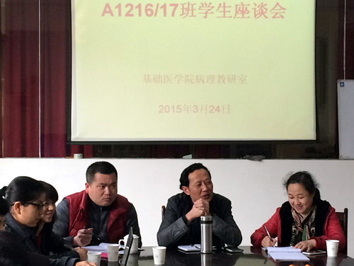 为了了解学生的学习基础和学习需求,激发学生的学习兴趣,培养学生主动学习能力,更好地理解和掌握病理学的基本知识,提高病理学的教学质量, 3月24日上午,基础医学院病理教研室在庐峰校区第一教学楼113实验室,召开了临床医学专业A1216/ A1217班学生座谈会。基础医学院副院长郑美蓉参加座谈会,病理教研室全体教师和临床医学专业A1216/ A1217班班干部、寝室长和学生代表参加了座谈会。座谈会由病理教研室主任胡志红教授主持。