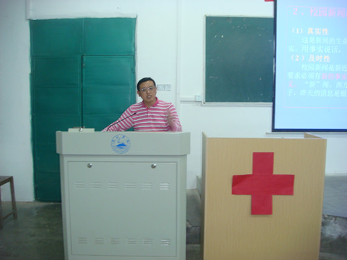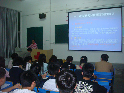 会上,吴彭年老师分别就“校园新闻和校园新闻的特点”、“校园通讯员怎样写新闻”、“常见采访提问方式的技巧”和“校园通讯员写作要注意的问题”四个方面作了详细的讲解。