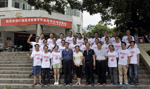 从附属医院的大门到新建的门诊部,从久违的宿舍到在修的教室,从熟悉的篮球场到办公楼,带着好奇,一路感受着惊喜,努力搜寻着每一个属于我们的那些记忆。在一教楼前,跃入眼帘的是基础医学院“热烈欢迎97级医学影像学专业同学回母校聚会”红底白字,我们很多同学的眼睛湿润了,十五年前,这里是他们毕业照的背景,曾经共同的根,拥有太多共同而美好的记忆,而如今,十五年后,大家又在楼前合影留念。