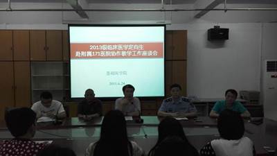2015年6月24日晚,根据九江学院决定在附属171医院安排临床医学协作教学的精神,基础医学院召开了2013级临床医学定向生赴附属171医院协作教学工作通报会和全体学生座谈会。基础医学院院长车向新教授、党委书记余朝阳参加座谈会。