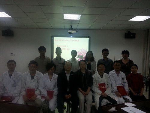 4月27-28日,车向新教授带领教育部、省卓越医师培养计划试点项目组成员协同医学部赴武宁县人民医院交流并检查第一批定向医学生县级医院毕业实习情况。县医院刘彩光院长、杨晓春副院长热情接待了车教授一行,5名导师和5名定向医学生参加了导师聘任座谈会议。