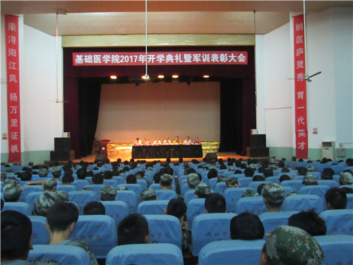 9月18日晚,基础医学院于浔东大礼堂举行了2017级新生军训表彰大会暨开学典礼。浔东校区管理办主任杨晓宁,医学部主任许礼生,基础医学院全体党政班子成员, 各教研室正副主任、各部门负责人,辅导员、新生班主任、学生助导及全体2017级新生参加会议,大会由基础医学院副院长郑美蓉主持。