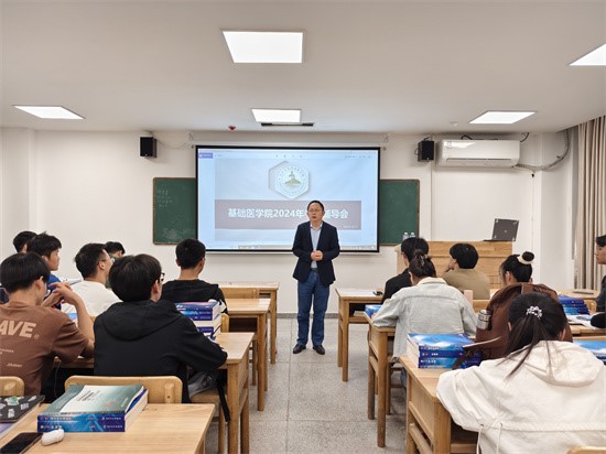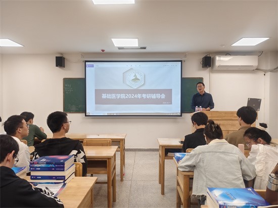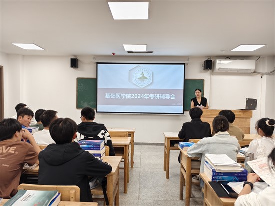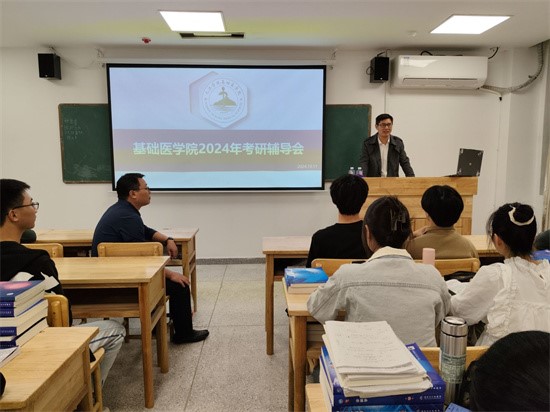 党委副书记刘频健主持此次会议。硕导熊建军博士介绍了考研学生的两个重要机遇:一是基础医学院自2024年起与上海理工大学联合培养生物医学工程硕士研究生;二是九江学院获得生物与医药硕士学位授予点并于2025年开始招生。他客观分析了这些机遇的优势,鼓励学生根据自身情况做出最佳选择,确保每一份努力都能得到相应的回报。