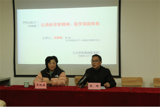 为了在青年大学生中大力宣传和倡导科学家精神,以科学家精神筑牢医学科学报国情怀,引导教育青年大学生“五育并举”,刻苦学习,积极进取,为建设医学强国贡献青春力量。12月11日下午,九江学院关心下一代工作委员会执行主任吴桃娥教授在基础医学实验楼635室为基础医学院学生作了题为“弘扬科学家精神,医学强国有我”的专题讲座。基础医学院党委书记张辉主持了讲座。基础医学院关工委主任刘频健及教师代表参加了此次活动。
