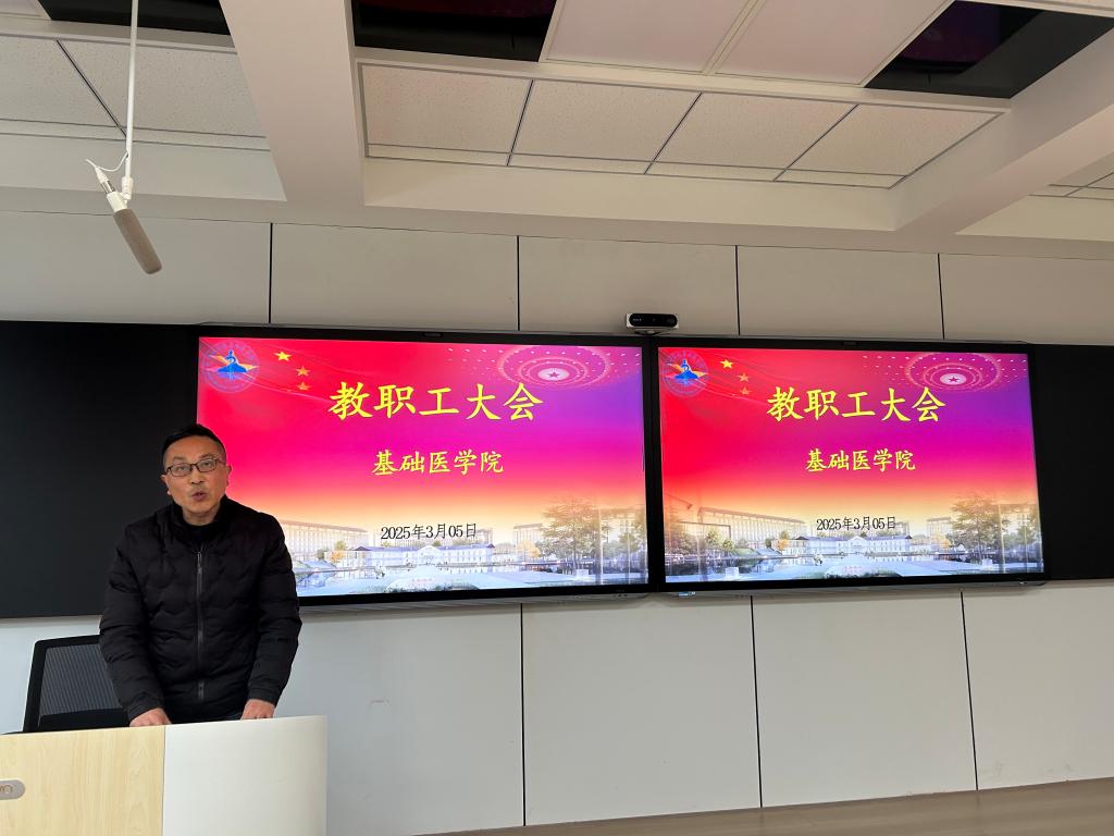 3月5日下午,基础医学院召开全院教职工大会,传达学校2025年第一季度安全稳定工作会议精神, 部署安排学院安全稳定工作。会议由学院党委书记张辉主持。