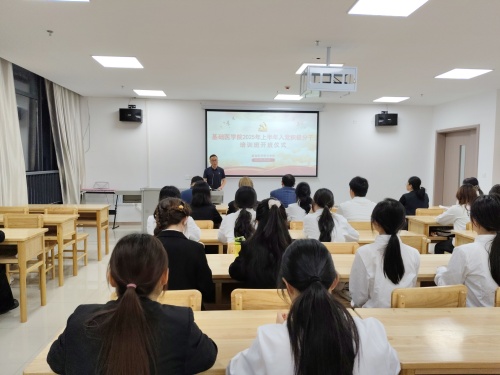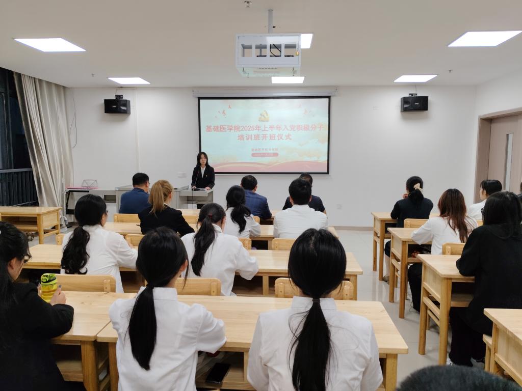 为深入学习贯彻习近平新时代中国特色社会主义思想、党的二十大和二十届二中、三中全会精神,高质量做好党员发展工作,严把党员发展“入口关”,4月23日,基础医学院2025年上半年入党积极分子培训班开班仪式暨专题党课培训在医创中心635会议室隆重举行。基础医学院党委书记张辉、副书记刘频健、学生思政科副科长樊云燕出席,旅游与地理学院党委副书记吴彭年应邀出席本次开班仪式,会议由专职组织员王孟楠主持。